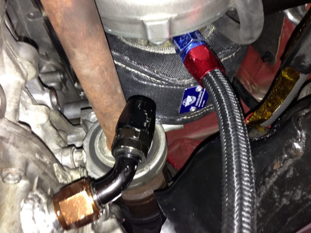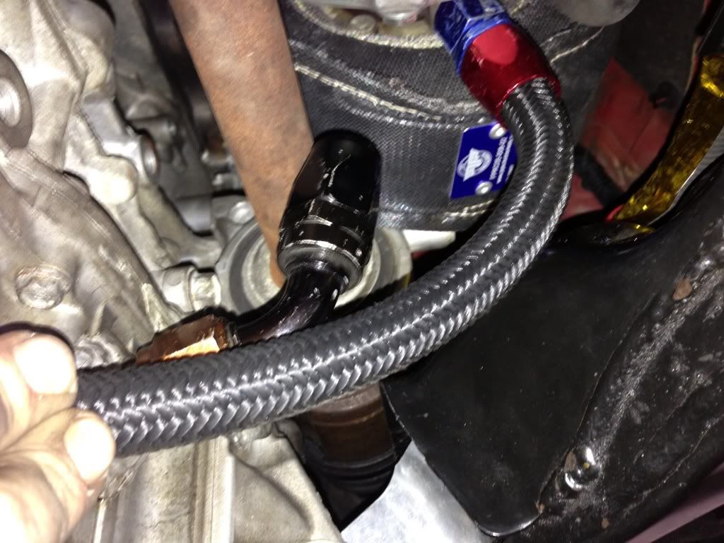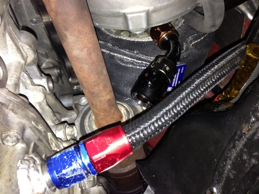 Well today I did a few things, wiring in boost controller and made all vac connections, coolant connections, and tried to get my oil drain line test fitting so I can cut the line and then saw this :(